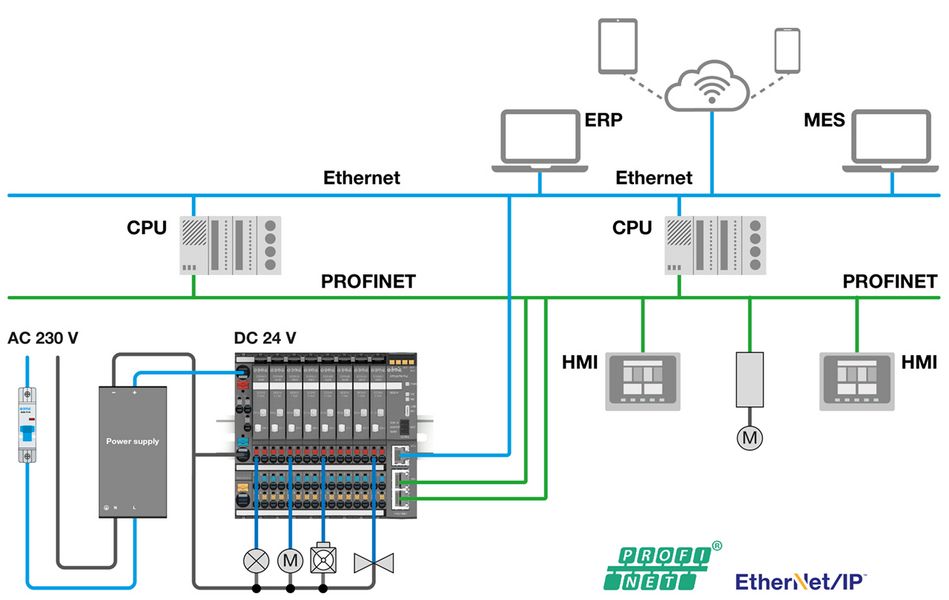 Il bus controller CPC20 è il cervello dell'intero sistema. Le sue interfacce offrono la connessione perfetta ai sistemi di livello superiore. A livello di campo, collega il sistema di distribuzione di alimentazione con le CPU e le HMI collegate tramite la sua interfaccia PROFINET e consente quindi lo scambio di dati richiesto. I valori di misura e le informazioni di stato possono essere visualizzate sia dagli operatori di sistema che dal personale di assistenza.